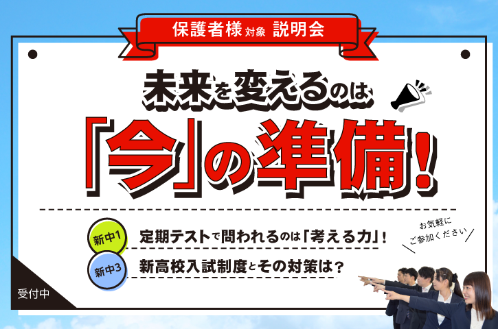 | 対象 | 新中学3年生(現中学2年生)の保護者様 サイエイにお通いでない方もお気軽にご参加ください |