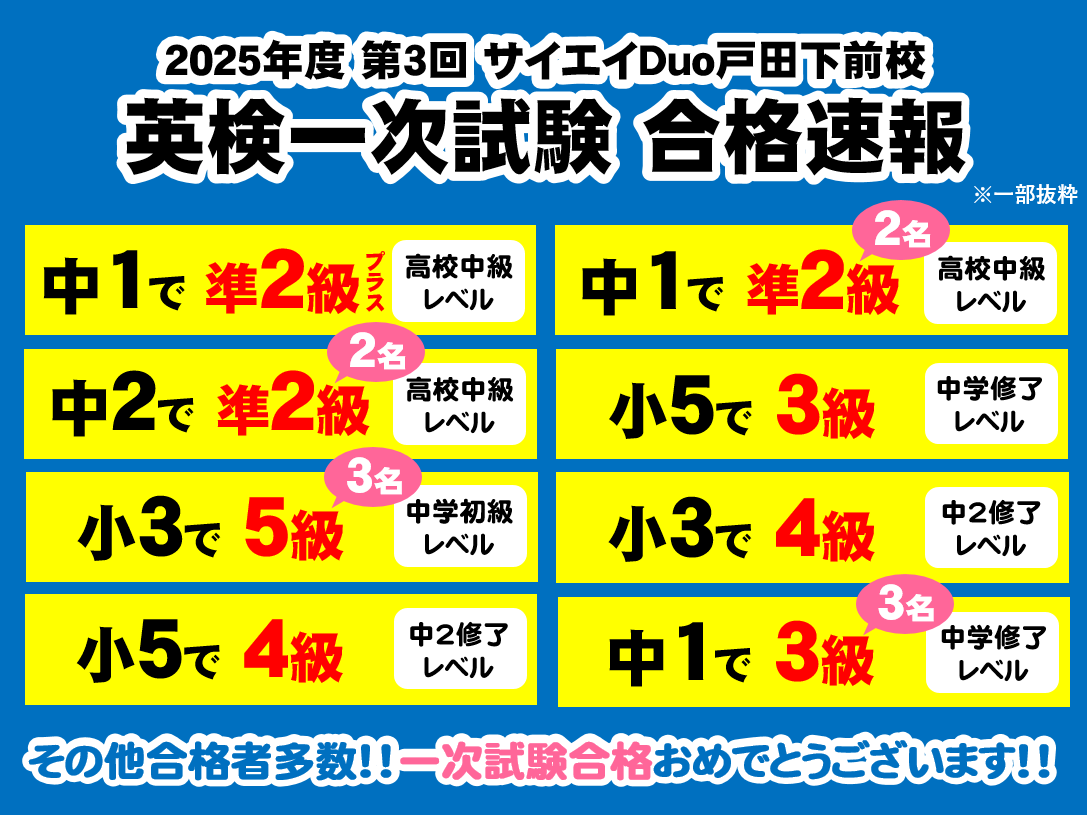 無料体験受付中! 詳しい日程・時間割はサイエイDuo戸田下前校へお問い合わせください。 お電話はコチラ>> 048-447-7336