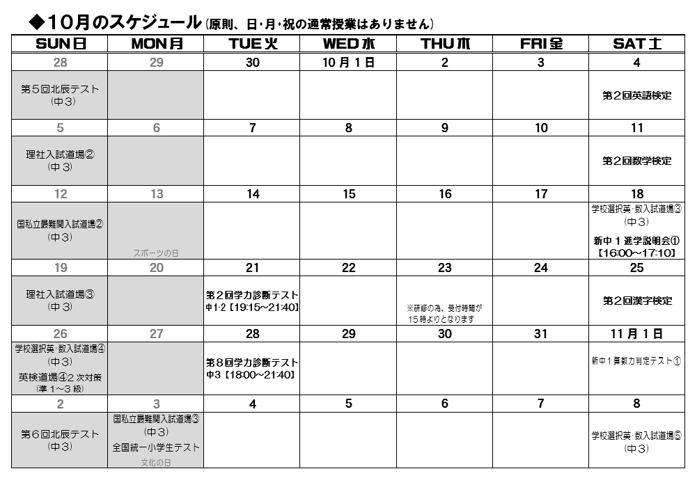 中学別予想問題演習10月11日(土) 13:00~18:00 5科ワーク特訓