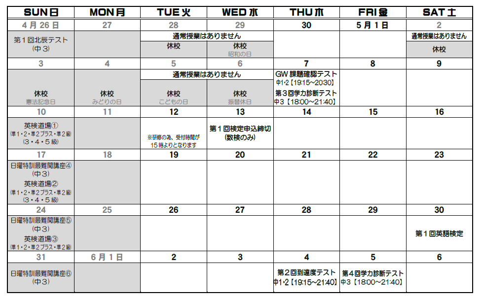 定期試験2週間前には土曜日・日曜日・祝日に教室を開放して、定期試験対策(学校のワーク特訓)を行います。